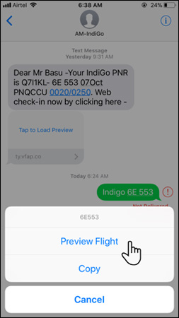 nhấn giữ thông tin đó > chọn Preview Flight’ width=’253′ height=’450′> Tính năng này hoạt động với bất kì ứng dụng nào trên iOS như Mail hay Notes.