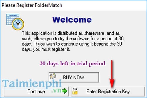 Bước 2: Sau khi đã cài đặt xong, khởi chạy chương trình. Ở hộp thoại đầu tiên chương trình sẽ thông báo bạn cần nhập thông tin bản quyền của chương trình. Lựa chọn Enter Registration Key để bắt đầu kích hoạt bản quyền miễn phí FolderMatch.