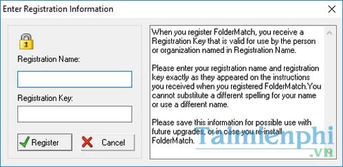Bước 4: Sau khi đã điền đầy đủ thông tin, nhấn Register để kích hoạt FolderMatch, chương trình sẽ hiện lên hộp thoại FolderMatch is now registered. Thank you. khi kích hoạt thành công.