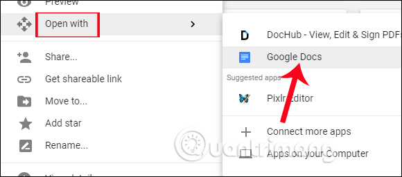 Sau đó bạn tiến hành tải hình ảnh mà bạn muốn trích xuất dữ liệu lên Google Drive. Tại hình ảnh được tải lên trên Google Drive, click chuột phải và chọn Open with (Mở bằng) rồi chọn Google Docs (Google Tài liệu).