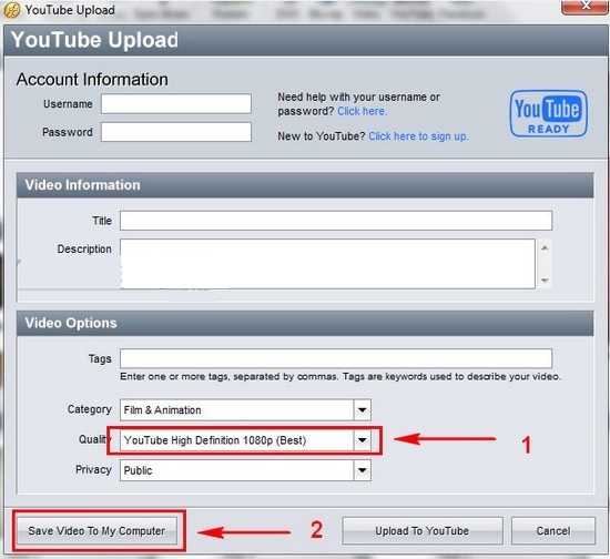 Bước 3: Trong tùy chỉnh Youtube Upload > Quality > Nhấn chọn YouTube High Definition 1080p (Best) > chọn Save Video To My Computer để lưu video về máy tính với tên đặt tùy chọn > Nhấn Save để lưu.