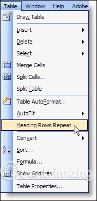 Với bản Word 2003, chúng ta sẽ nhấn vào tab Table rồi chọn Heading Rows Repeat như hình ở dưới đây.