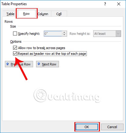 Xuất hiện giao diện hộp thoại Table Properties. Tại đây người dùng hãy click vào tab Row, sau đó tại nội dung bên dưới click chuột vào tùy chọn Repeat as heder row at the top of each page, nhắc lại thanh tiêu đề ở phía trên bảng cho từng trang. Nhấn OK để lưu lại thiết lập mới.