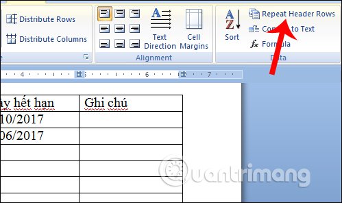 Trong danh sách tùy chọn Layout, người dùng click vào tính năng Repeat Header Rows, nhắc lại thanh tiêu đề ở các cột trong bảng danh sách.