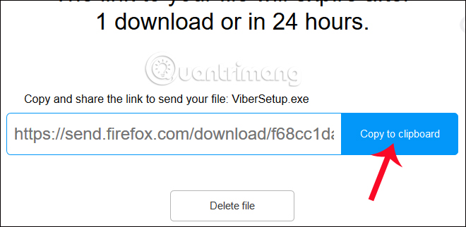 Sau khi tải lên máy chủ Mozilla thành công, dịch vụ sẽ hiển thị liên kết tải về của dữ liệu này. Nhấp chuột vào nút Copy to clipboard. Sau đó, chúng ta chỉ cần gửi link đó tới người nhận là được.
