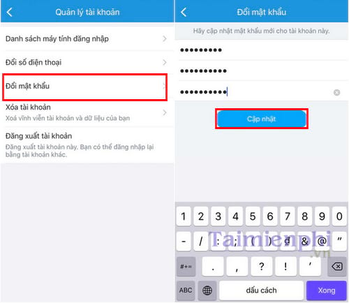 Bước 2: Tiếp theo các bạn chọn Đổi mật khẩu, nhập chính xác lại mật khẩu cũ đồng thời tạo mật khẩu mới bên dưới và nhấn Cập nhật.