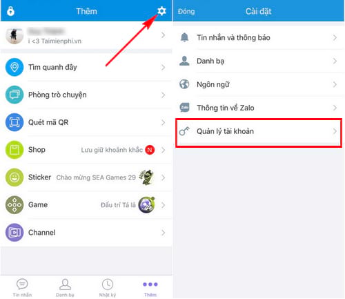 Bước 1: Từ giao diện sử dụng chính của Zalo trên điện thoại, các bạn chọn tab Thêm (biểu tượng dấu ba chấm), sau có chạm vào Settings (hình bánh răng cưa) ở góc trên bên phải màn hình và chọn Quản lý tài khoản.