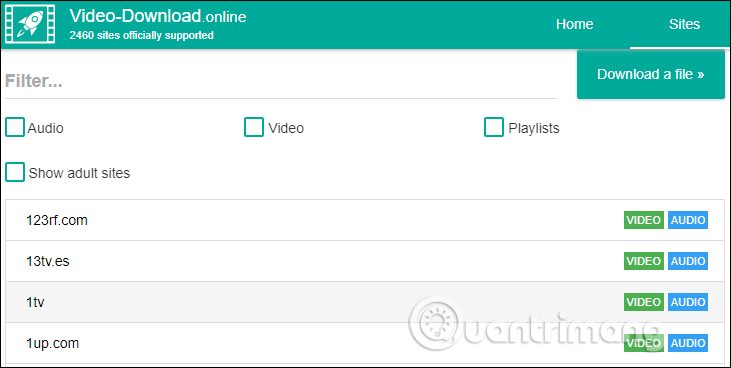 Tại giao diện trang, để biết thêm những trang web hỗ trợ tải video, nhấp chọn vào nút Sites bên trên. Xuất hiện danh sách các trang web mà Video Download hỗ trợ. Ở từng trang web, dịch vụ sẽ ghi rõ hỗ trợ tải video, audio hoặc tải toàn bộ file trong playlist. Chẳng hạn với Youtube, Zing Mp3 được hỗ trợ tải audio, video lẫn playlist. Nếu muốn dễ lọc loại tập tin media muốn tải, bạn có thể sử dụng bộ lọc bên trên.