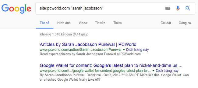 cworld.com ‘sarah jacobsson purewal’ sẽ cung cấp cho bạn một danh sách kết quả tìm kiếm tìm thấy chỉ trong trang PCWorld.com. Nếu bạn muốn biết những công cụ tìm kiếm này có thể lấy được thông tin gì về mình hãy thử làm tương tự như trên và thay tên tìm kiếm bằng tên bạn nhé.