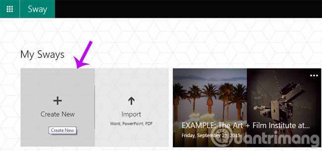 Để bắt đầu, bạn nhấn vào nút Create New ở trang chủ của Sway.