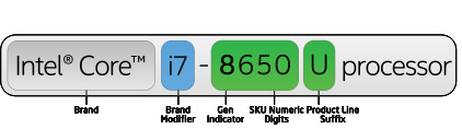Trong ảnh trên, i7 là dòng sản phẩm. Số đầu tiên trong chuỗi 4 chữ số (8650) sau brand modifier cho biết thế hệ bộ xử lý Intel của bạn. Ba chữ số còn lại là số SKU (mã hiệu sản phẩm). Tùy thuộc vào hệ thống của bạn, con số này có thể dao động từ 3 đến 8.