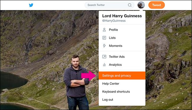 Các này hoạt động trang web Twitter do đó hãy truy cập vào trang Twitter.com trong trình duyệt của bạn. Nhấp vào biểu tượng profile, sau đó chọn Settings and Privacy.