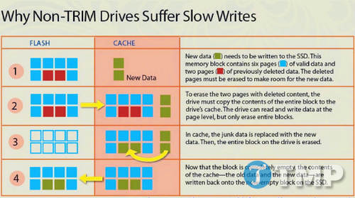 Về cơ bản, SSD ghi và xóa dữ liệu khác nhau. SSD sử dụng bộ nhớ flash, tương tự như bộ nhớ RAM, chỉ khác là SSD lưu lại dữ liệu sau khi tắt nguồn. SSD lưu trữ thông tin trong ‘khối’, còn ổ cứng lưu trữ dữ liệu trên phiến đĩa. Do đó, ổ đĩa cứng có thể ghi thông tin ở bất kỳ vị trí nào, nhưng trước tiên phiến đĩa cần phải quay về vị trí chính xác. SSD phải tìm một khối rỗng để ghi dữ liệu vào đó. Vì kích thước SSD tăng dần theoo thời gian, quá trình ghi dữ liệu sẽ chậm dần hơn vì các khối trống có sẵn là rất ít, bắt buộc phải ghi đè lên dữ liệu.