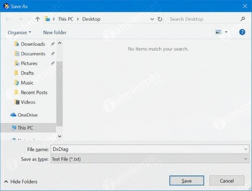 Bước 3: Trên cửa sổ DirectX Diagnostic Tool, click chọn Save All Information và chọn vị trí để lưu file text DxDiag, nên chọn vị trí lưu trữ trên màn hình desktop để việc tìm kiếm file dễ dàng hơn. Sau khi chọn xong vị trí lưu trữ file, click chọn Save.