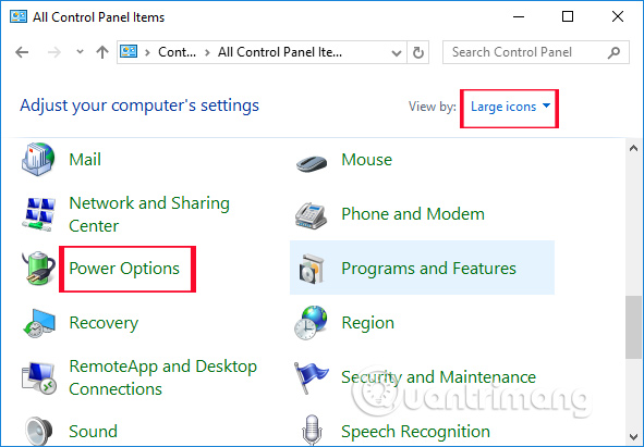 Chuyển sang giao diện tiếp theo. Tại đây bạn sẽ chuyển mục View by thành Large icons. Sau đó ở danh sách bên dưới nhấp chuột vào phần Power Options.