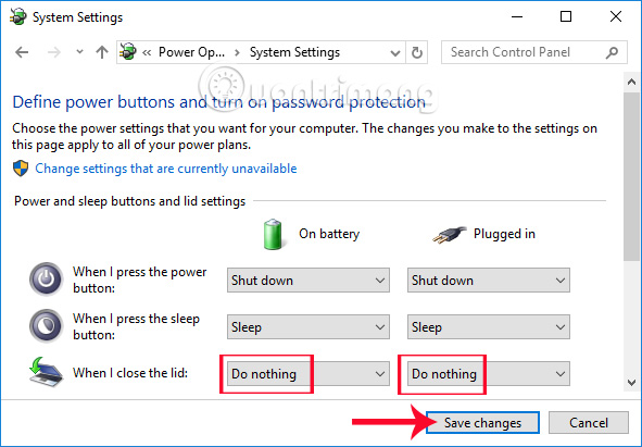 Trong giao diện System Settings, xuống phần When I close the lid, bạn chọn Do nothing trong danh sách menu xổ xuống ở cột On battery và Plugged như hình. Cuối cùng nhấn Save changes ở bên dưới để lưu lại thay đổi.