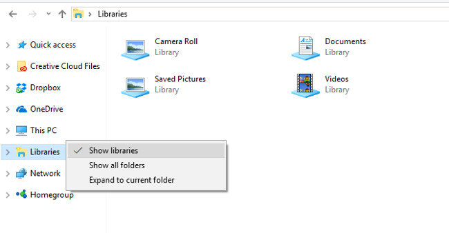 Thư viện được giới thiệu trong Windows 7, cung cấp một cách mới để quản lý các tệp của bạn. Mặc dù chúng thực sự hữu ích nếu bạn dành thời gian để thiết lập đúng cách, nhưng nó vẫn khiến người dùng bối rối. Do đó, Microsoft đã giấu nó trong Windows 8.1 và Windows 10. Nó vẫn ở đó và bạn chỉ cần kích hoạt để sử dụng. Mở một cửa sổ File Explorer, sau đó nhấp chuột phải vào bất kỳ thanh shortcut nào bên trái. Nhấp vào tùy chọn Show libraries và bạn sẽ thấy tiêu đề Libraries mới ở thanh bên trái. Nhấp đúp vào mục này sẽ thấy Documents, Pictures và các mục tương tự. Để truy cập chúng, bạn cũng có thể gõ shell:Libraries vào thanh điều hướng của bất kỳ cửa sổ File Explorer nào.