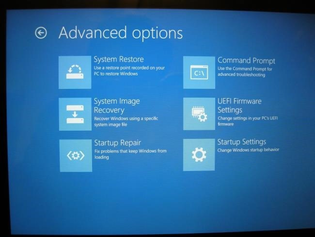 Để truy cập UEFI Firmware Settings, hãy nhấp vào ô Troubleshoot, chọn Advanced Options, và click UEFI Firmware Settings.