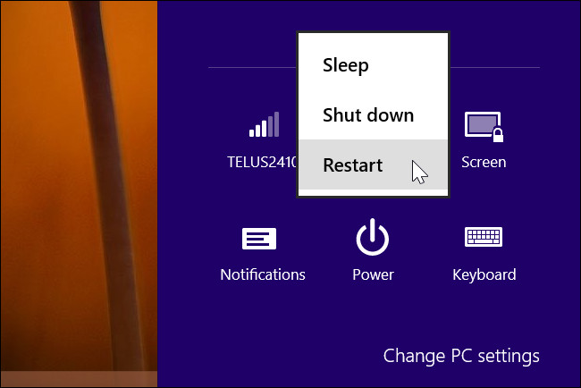 Với máy tính hiện đại thay vì phải chờ vài giây để nhấn phím và làm chậm quá trình khởi động, bạn có thể truy cập menu boot sau khi khởi động vào Windows. Để truy cập menu này, mở thanh Settings – hoặc kéo từ bên phải và bấm Settings hoặc nhấn phím Windows + I. Chọn nút Power bên dưới thanh Settings, nhấn và giữ phím Shift, và click Restart. Máy tính của bạn sẽ khởi động lại trong menu boot. Lưu ý: nếu đang sử dụng Windows 10, bạn có thể vào tùy chọn Power từ menu Start. Chỉ cần giữ phím SHIFT và nhấp vào Restart.