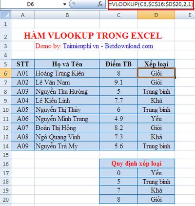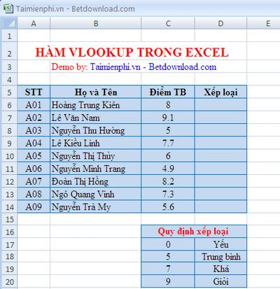 VD: Căn cứ vào bảng quy định xếp loại tương ứng với điểm đã cho, tiến hành xếp loại học lực cho các sinh viên có tên trong danh sách dưới: