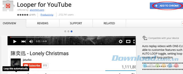 Ngoài 3 cách trên, bạn có thể sử dụng tiện ích mở rộng của trình duyệt Chrome mang tên: Looper for YouTube. Cho phép tự phát lại video theo mặc định mà không cần nhấn nút Replay. Thậm chí, Looper còn cho phép bạn thiết lập số lần phát lại, chọn đoạn muốn phát lại một cách dễ dàng. Để sử dụng tiện ích mở rộng này, bạn hãy tải Looper for YouTube. Sau đó, nhấn vào nút Add to Chrome để thêm vào trình duyệt.
