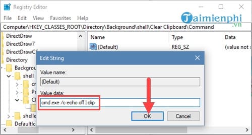 Bước 5: Trong thư mục Command bạn click vào file Default và nhập dòng lệnh cmd.exe /c echo off | clip và xác nhận bằng OK nhé.